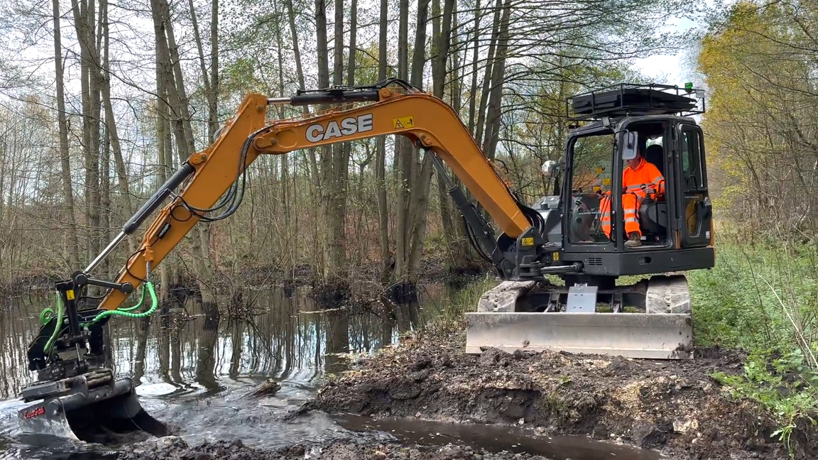 Massive excavator cleaning riverbank with precision