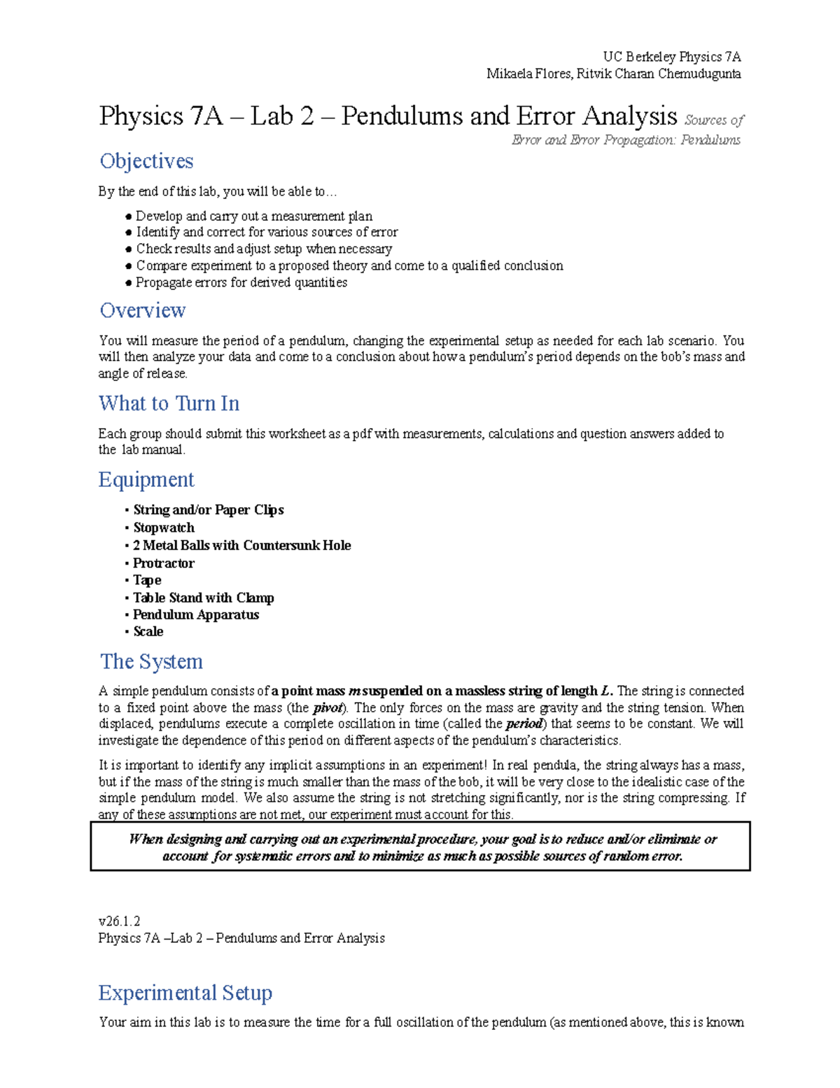 Physics 7A Lab 2: Pendulums & Error Analysis Techniques - Studocu