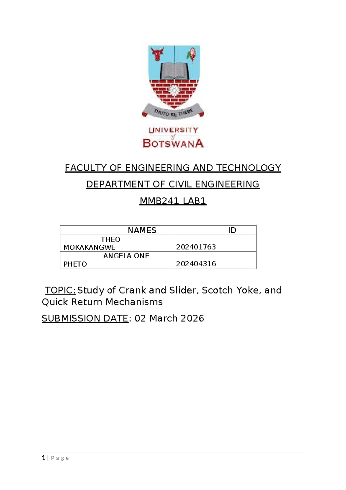 MMB241 Lab 1: Study of Crank and Slider, Scotch Yoke, and Quick Return ...