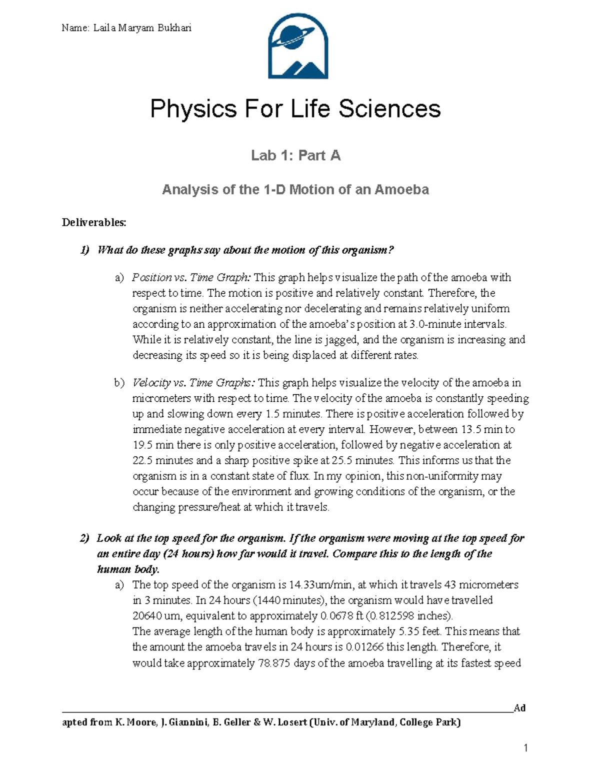 LAB 1A Physics 130: Analyzing Amoeba Motion and Velocity - Studocu