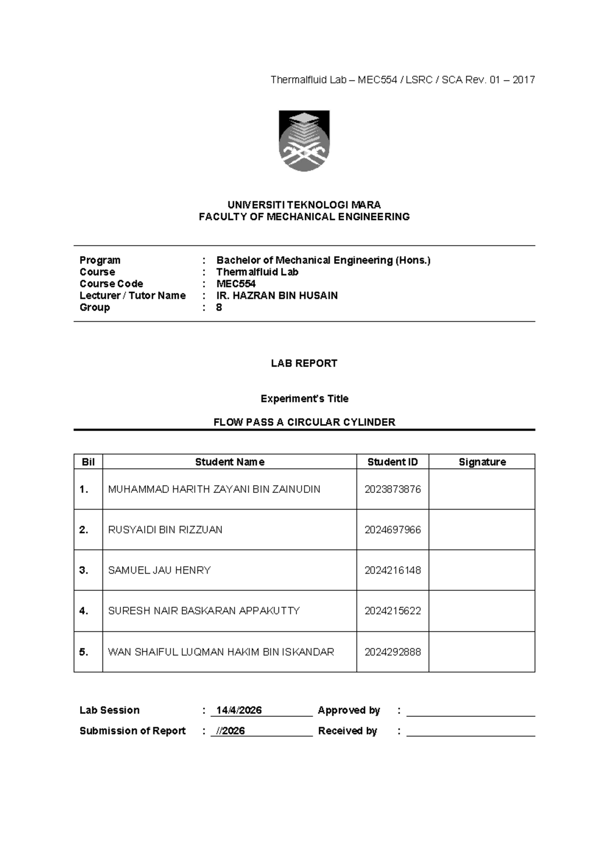 Thermalfluid Lab Report: Flow Past a Circular Cylinder MEC554 - Studocu