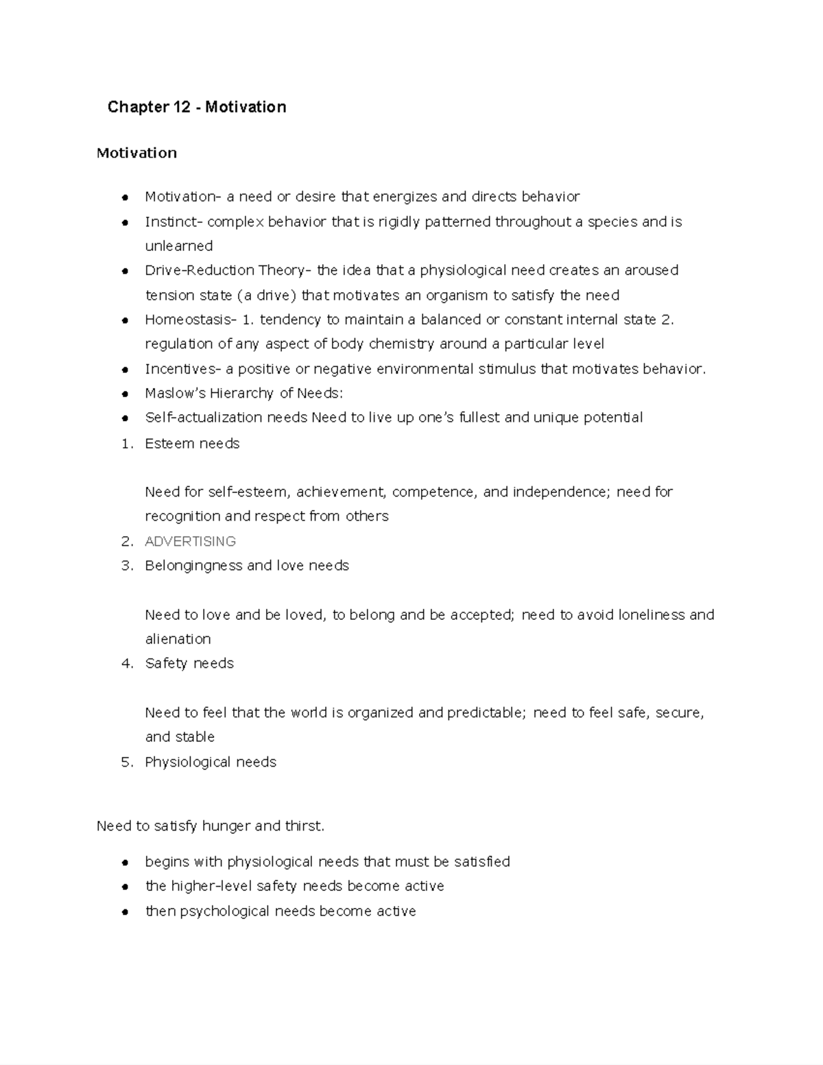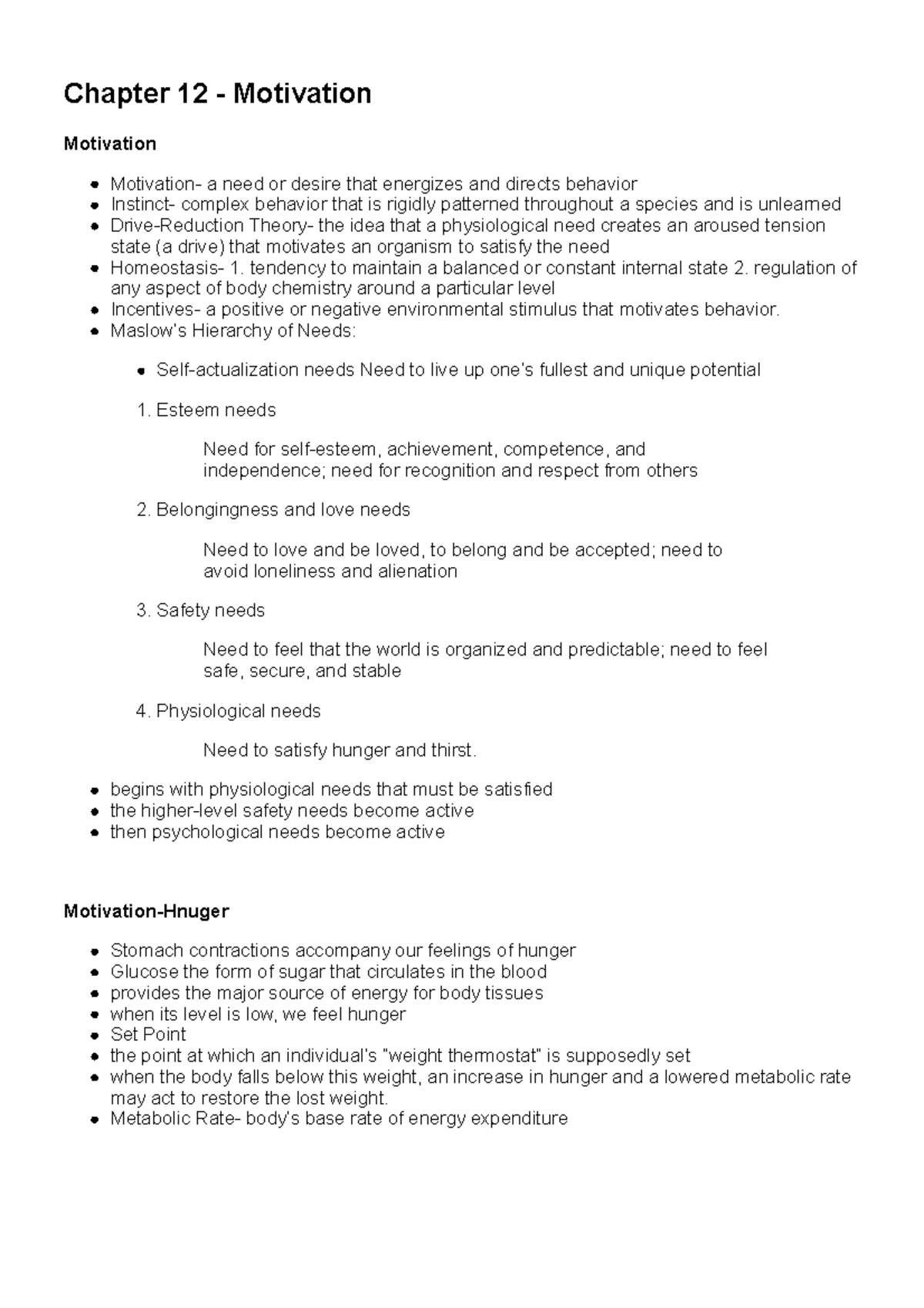 Chapter 12 Notes - Chapter 12 Notes: Motivation and Emotion Theories ...