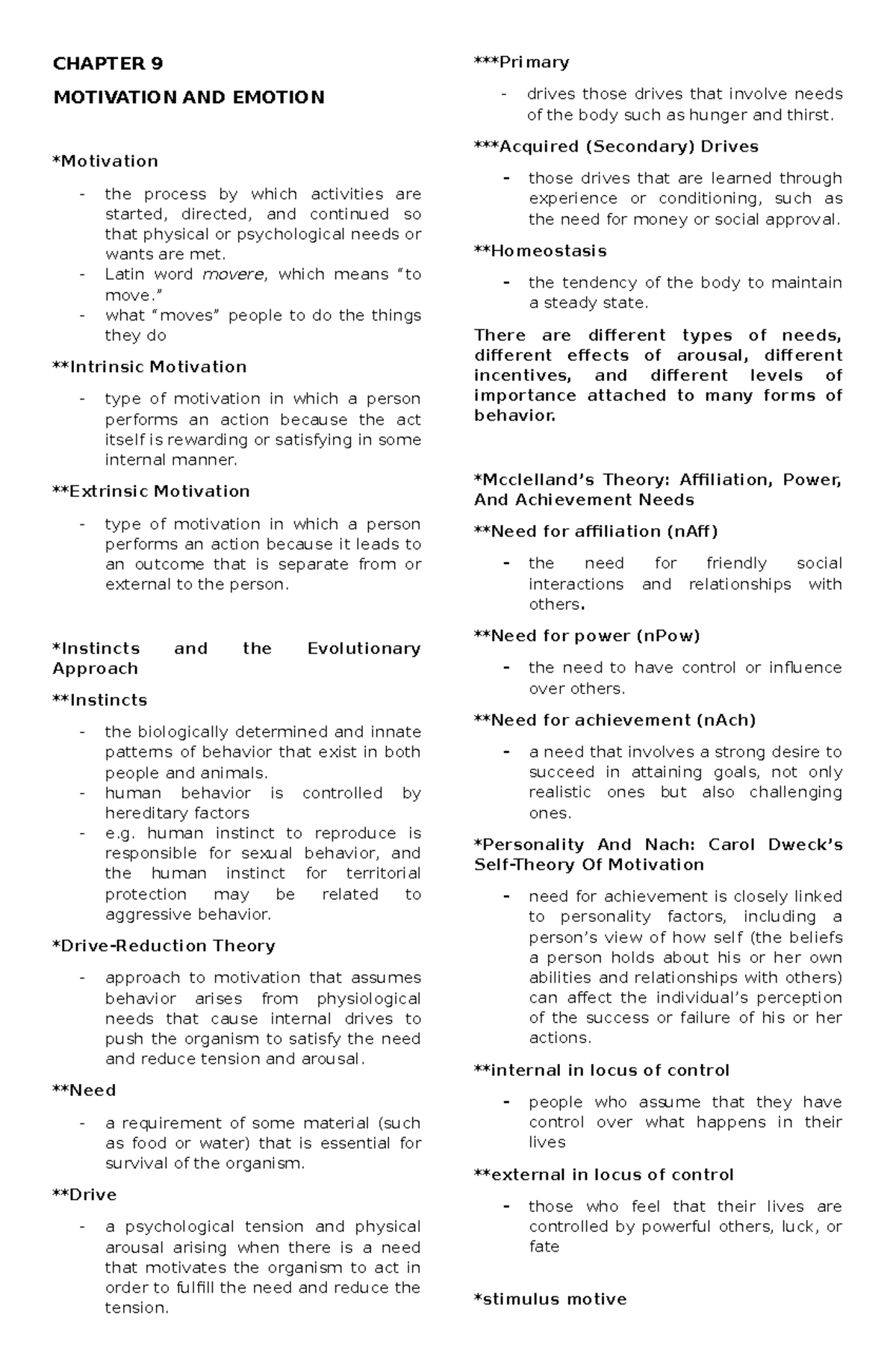 Psychology - Motivation and Emotion Overview (Chapter 5 Notes) - Studocu