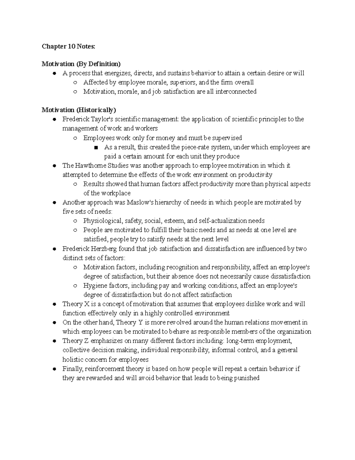 Chapter 10 Notes - Chapter 10 Notes Motivation Theories and Concepts of ...
