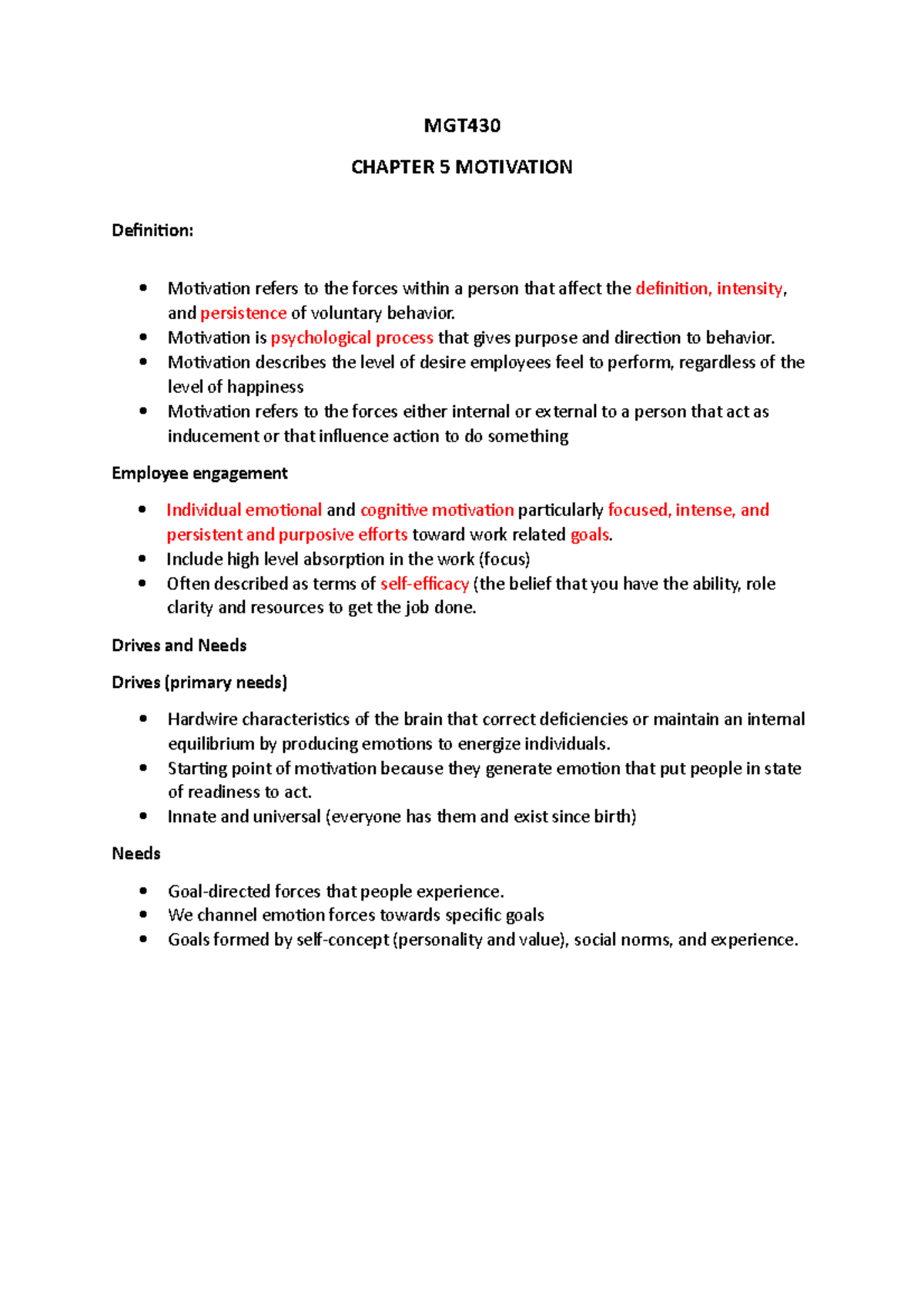 Notes chapter 5 and 6 Mgt430 - MGT CHAPTER 5 MOTIVATION Definition ...