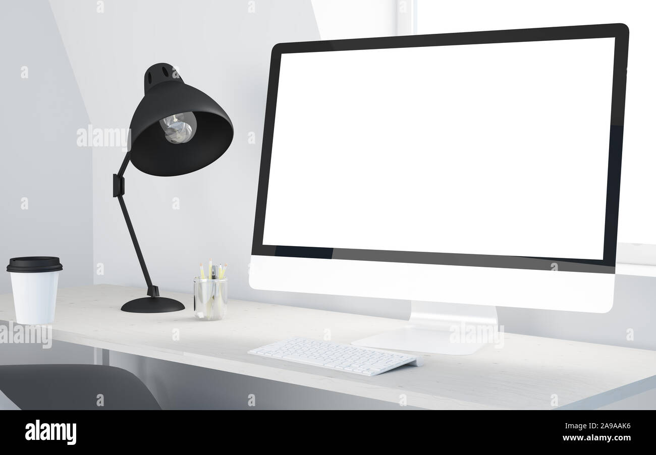 Close up of desktop with empty computer screen Mock up 3D Rendering ...