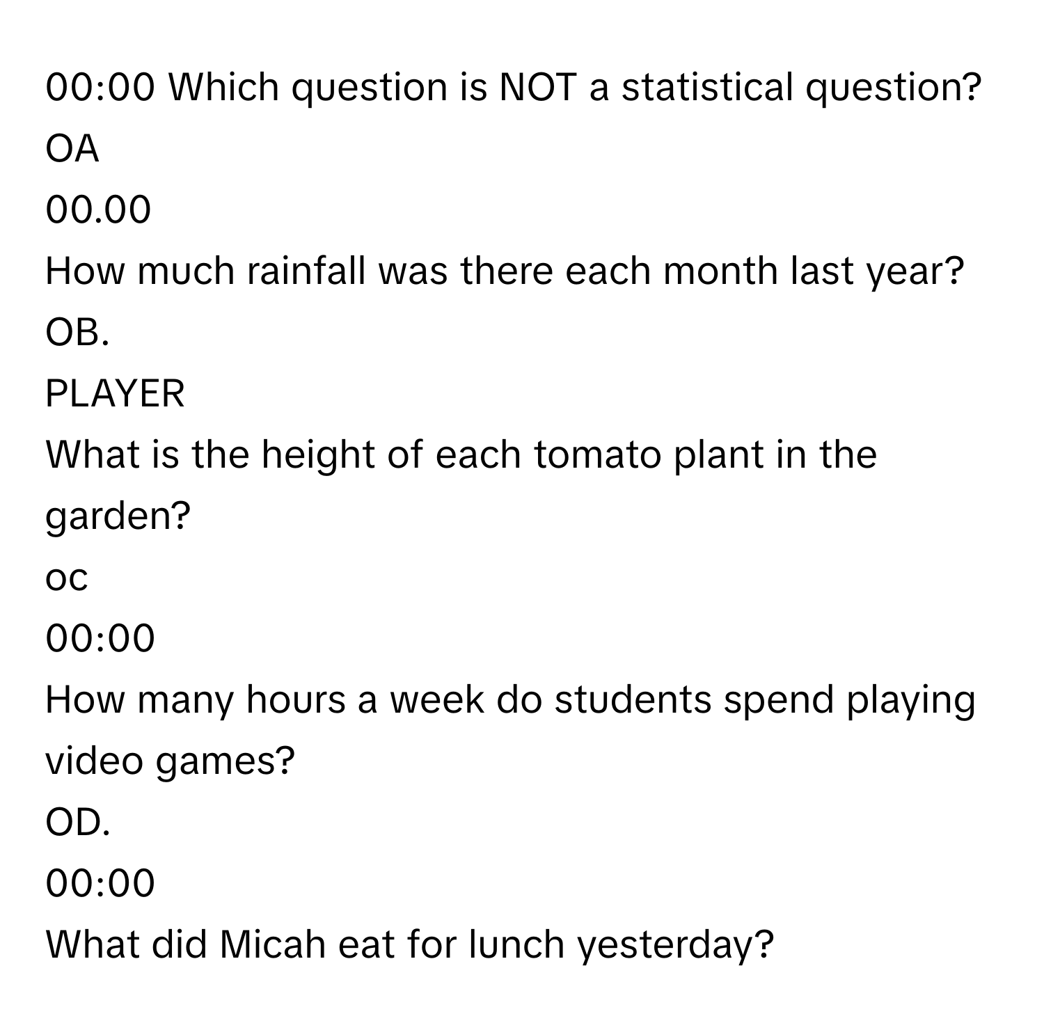 Solved: 00:00 Which question is NOT a statistical question? OA 00.00 ...