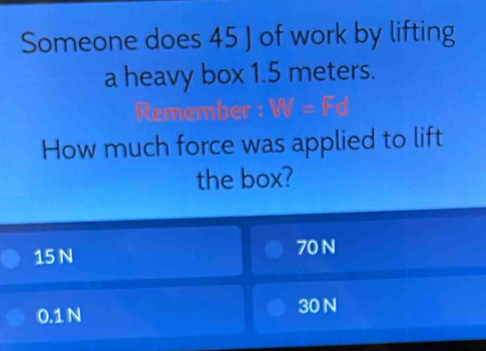 Solved: Someone does 45 J of work by lifting a heavy box 1.5 meters ...