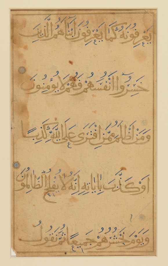 Bonhams : A Qur'an leaf written in muhaqqaq script in gold (sura VI, al ...