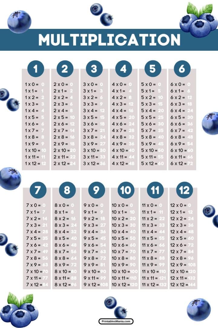 Printable Multiplication Chart for Times Tables 1 to 12 by AwesomeDesigns