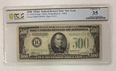 1934 A $500 Five Hundred Dollar Federal Reserve New York Mule Note ...