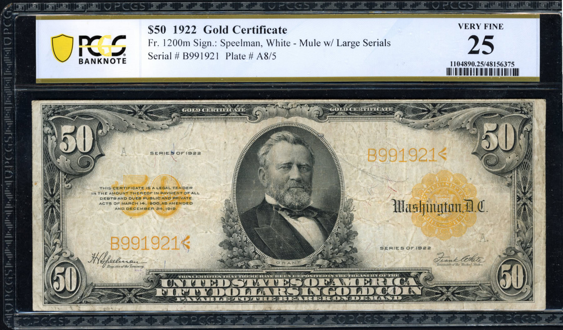 Fr. 1200m 1922 $50 Gold Certificate Mule Note Speelman / White PCGS ...