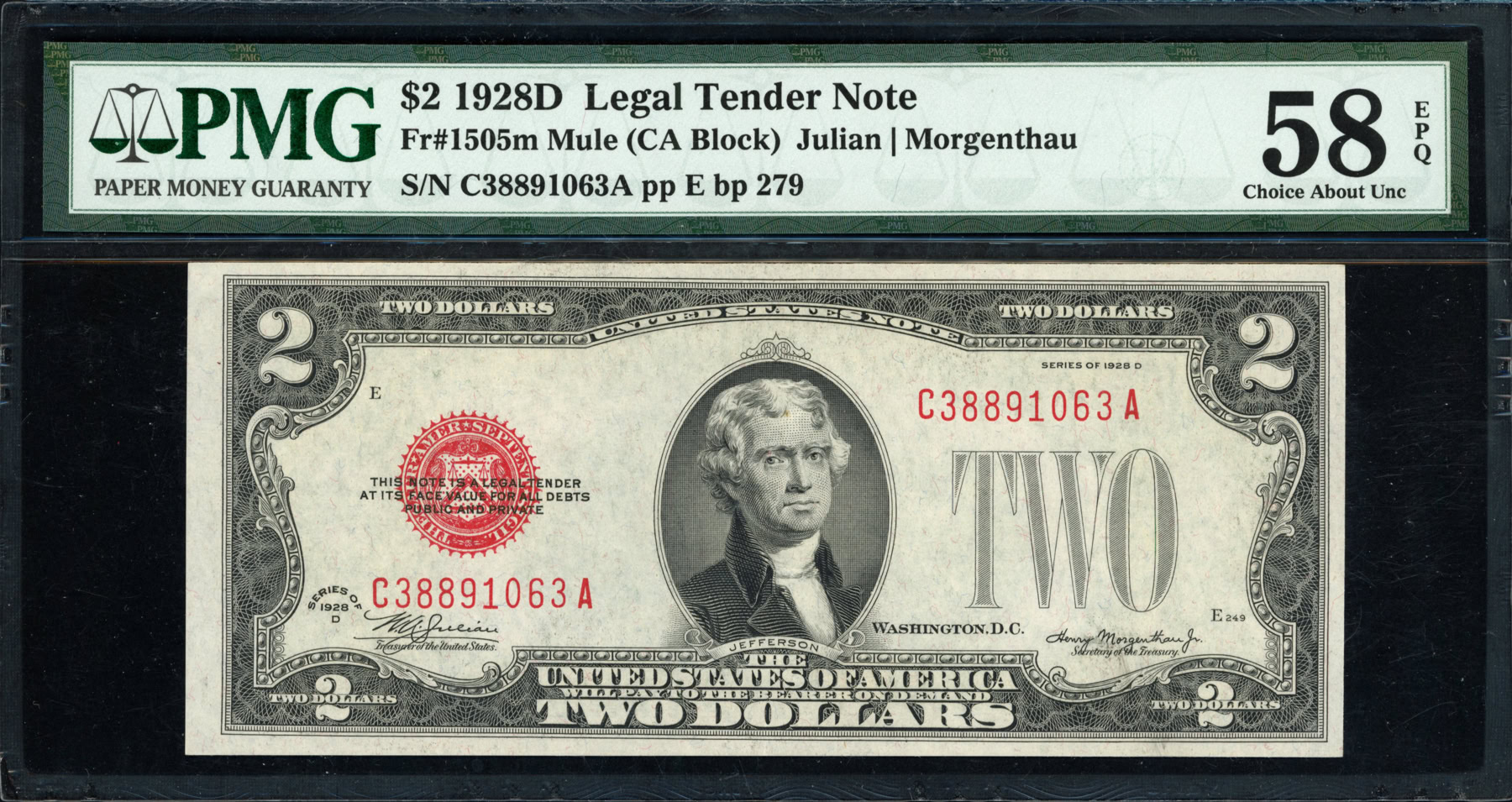 Fr. 1505m (CA Block) 1928D $2 Legal Tender Mule Note Julian ...