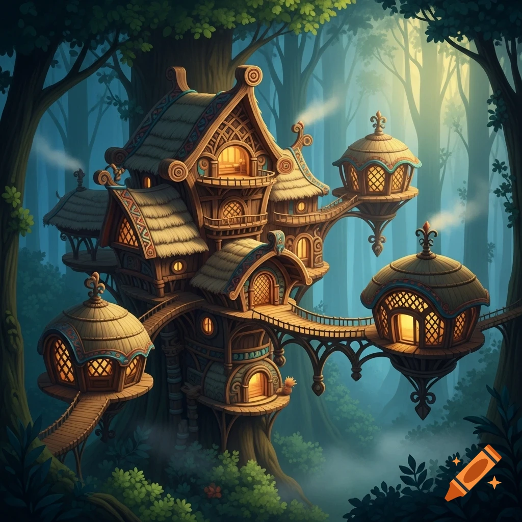 A whimsical, multi-level treehouse with large leaves, glowing windows ...