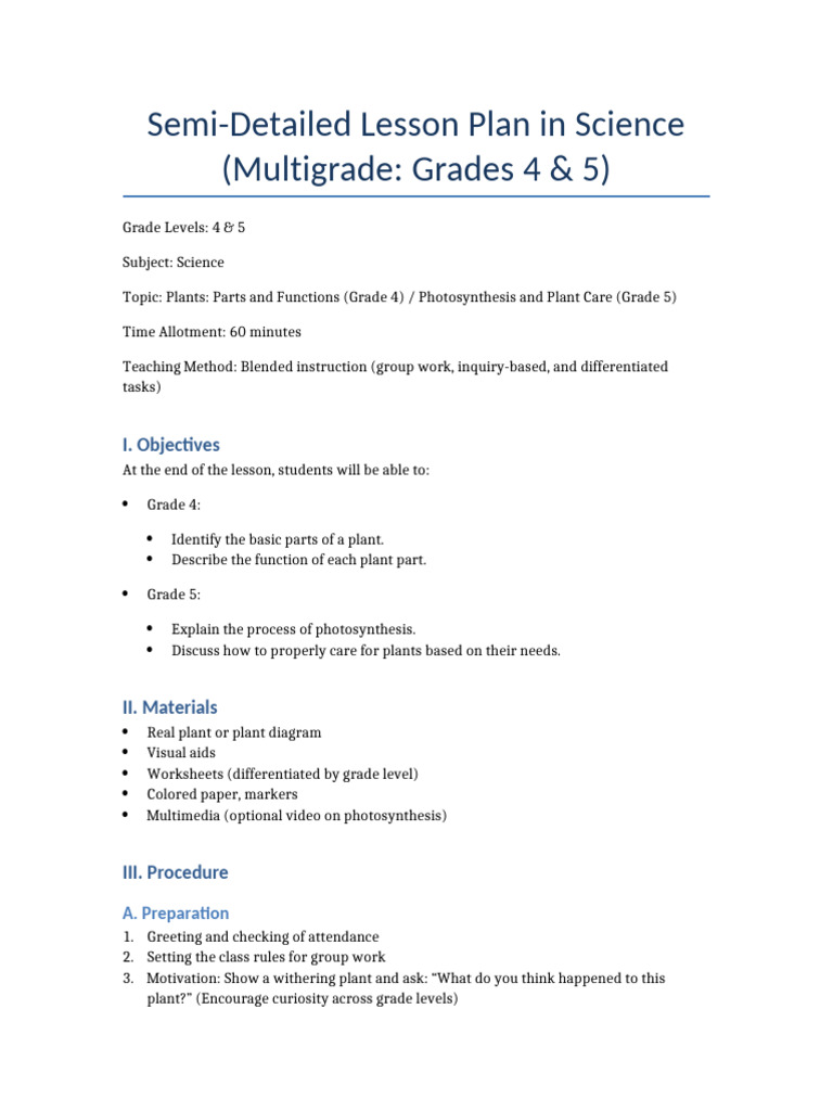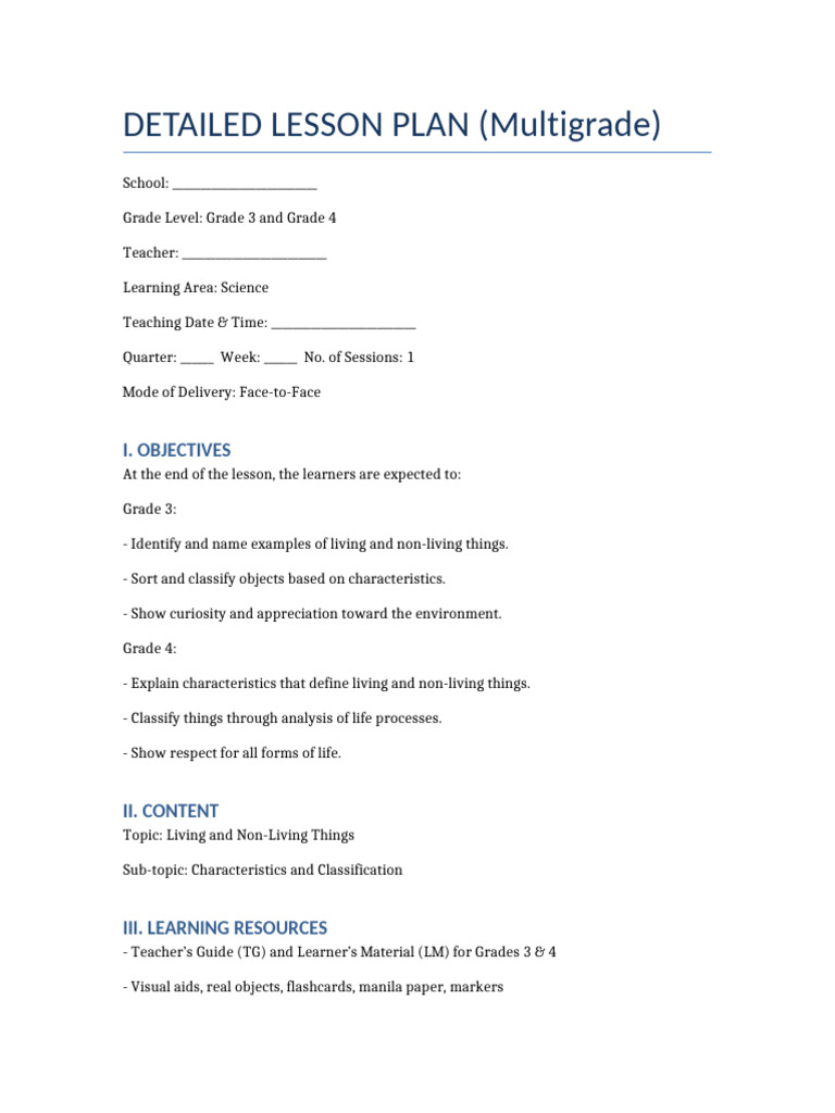 SOLUTION: Lesson plan sample in multigrade classes - Studypool