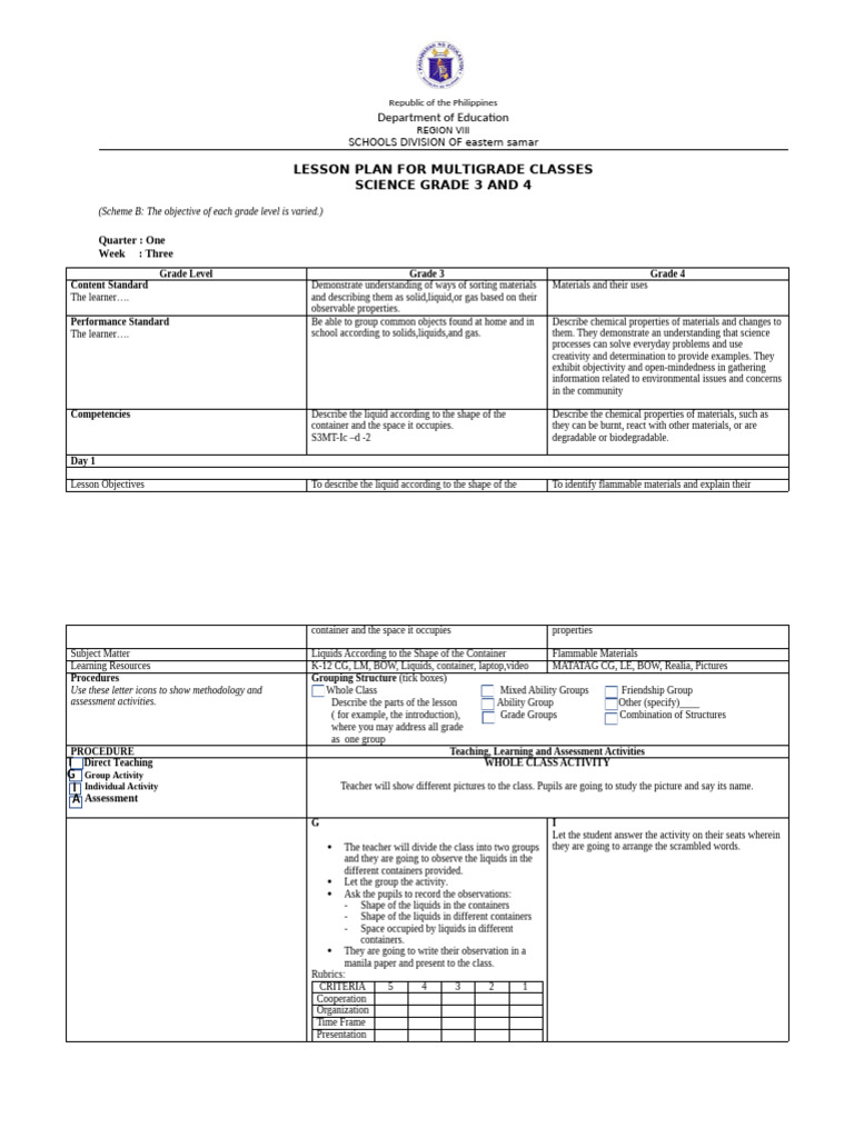 Multigrade Lesson Plan: Science for Grades 3 & 4 on Matter - Studocu