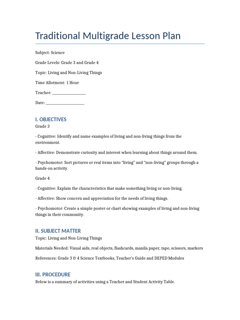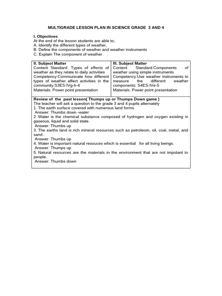 Traditional Multigrade Science Lesson Plan With Table | PDF | Lesson ...
