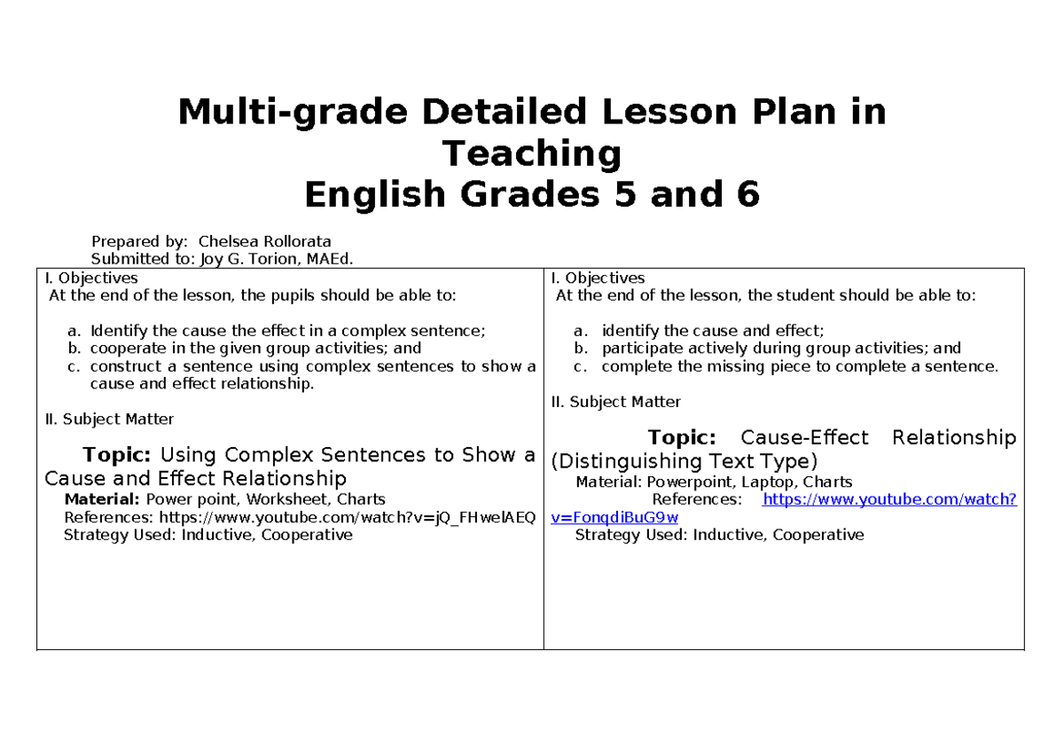 Multi-Grade Lesson Plan: Complex Sentences & Cause-Effect (Eng 5-6 ...