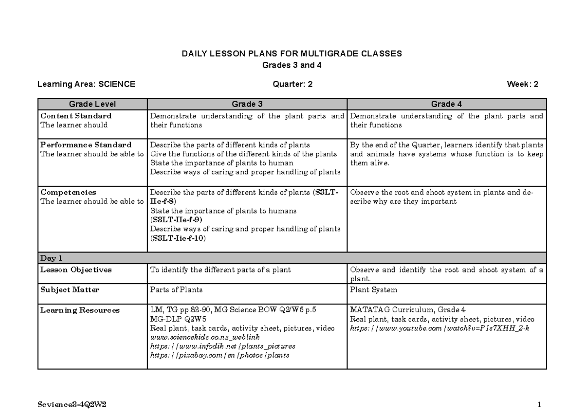 Science-34 Q2W2: Daily Lesson Plans for Multigrade Classes on Plant ...