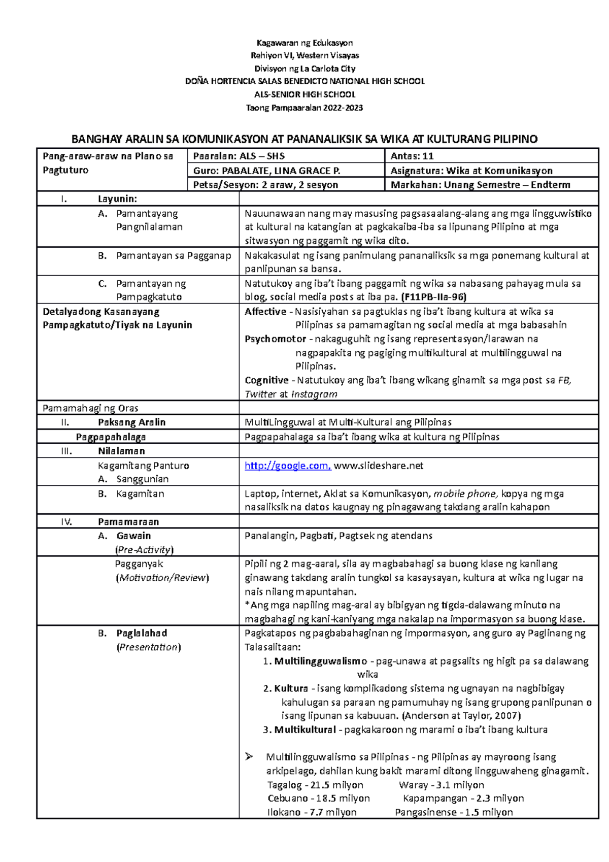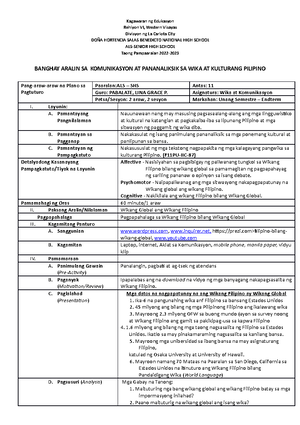2 Multilingguwal at Multikultural sa Pilipinas: Banghay Aralin - Studocu