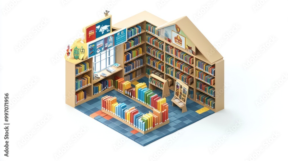 Multilingual library with cultural displays, depicted in a top-down ...