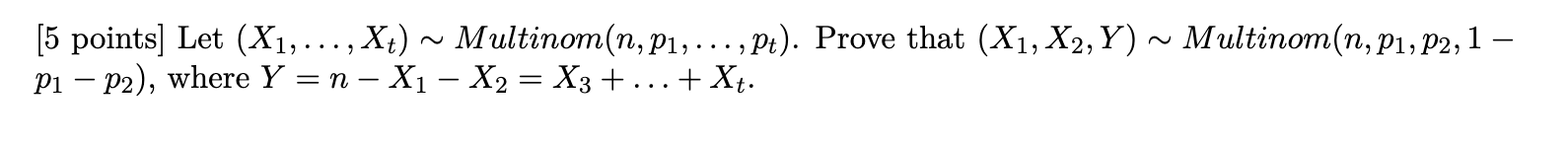 Solved [5 points] Let (X1,…,Xt)∼Multinom(n,p1,…,pt). Prove | Chegg.com
