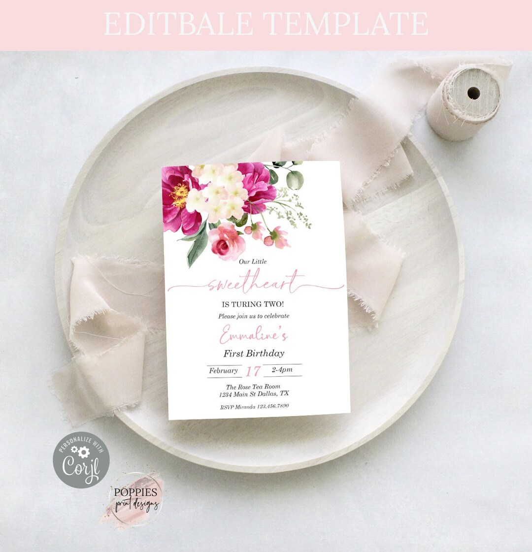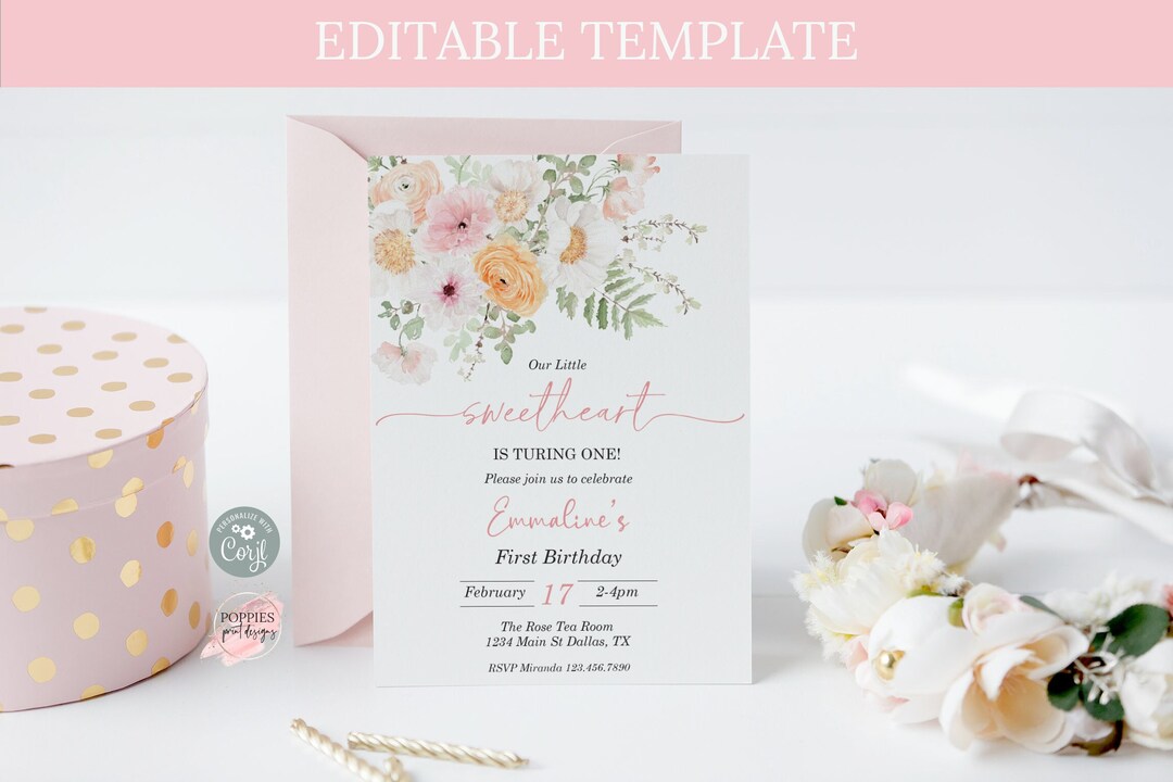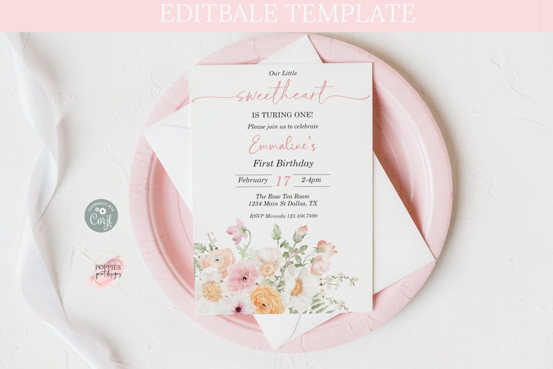 Editable Sweetheart Birthday Invitation Floral Heart Birthday Invite ...