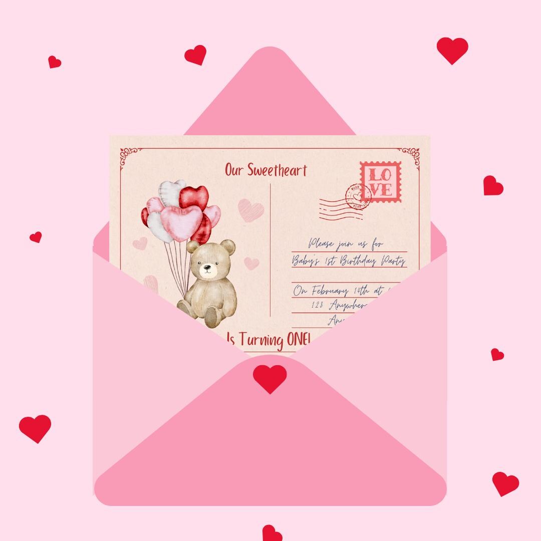 A Little Sweetheart Bear-y First Birthday Invitation, Valentine Heart ...