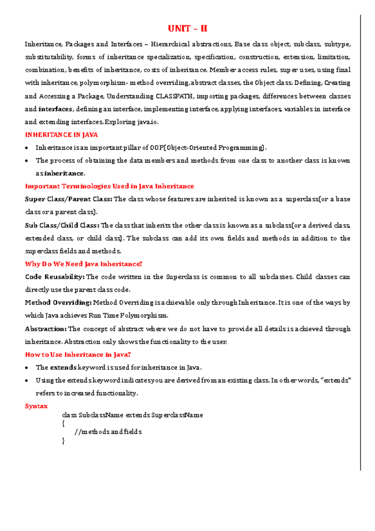 JAVA UNIT II: Inheritance, Packages, and Interfaces Overview - Studocu
