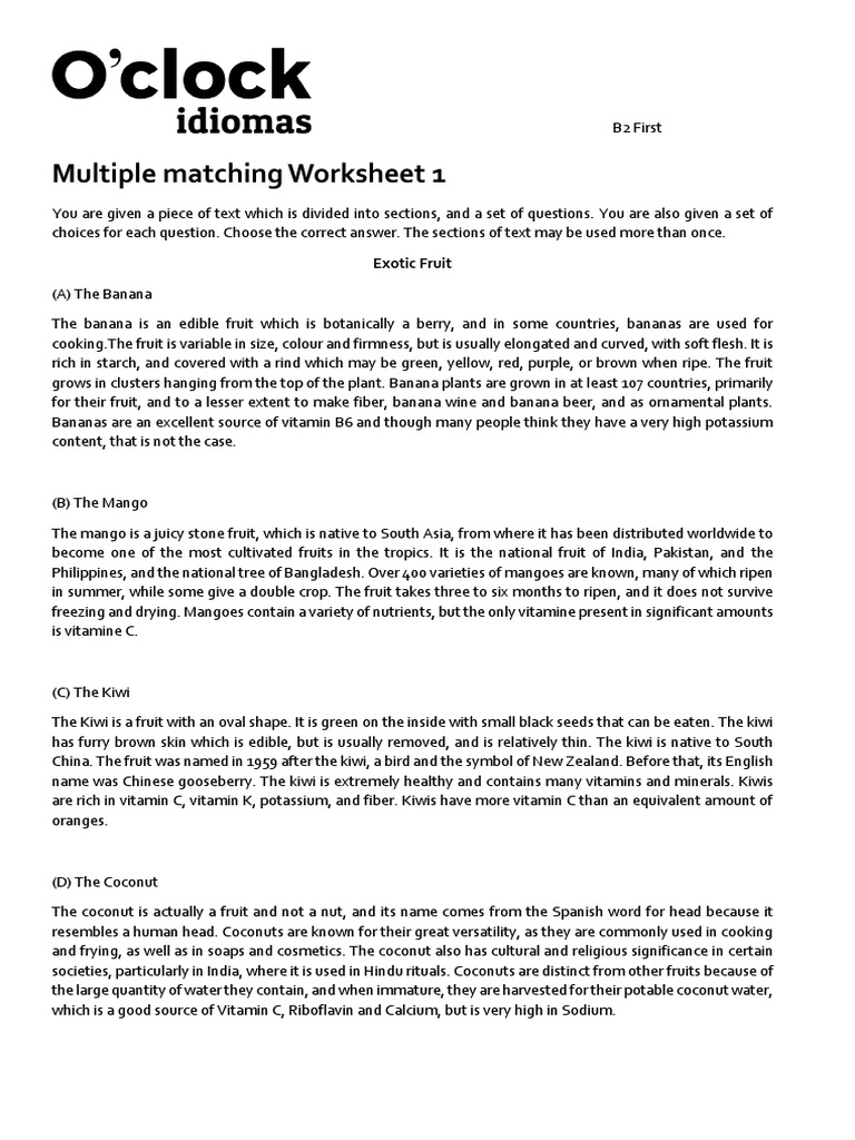 Multiple Matching Worksheet 1: Exotic Fruit | PDF | Banana | Mango