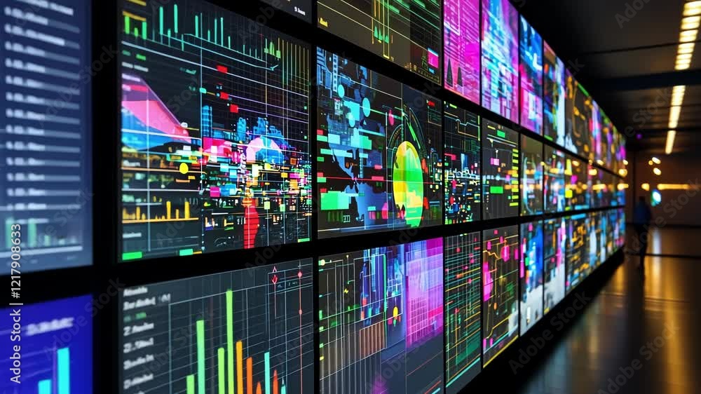 Multiple monitors in a monitoring room show charts, graphs, and data ...