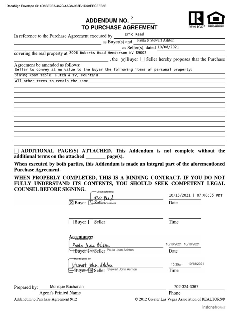 PERSONAL PROPERTY ADDENDUM TO PURCHASE AGREEMENT | Nevada Legal Forms ...