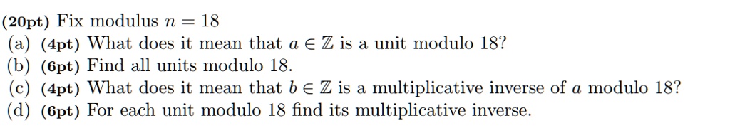 (20pt) Fix modulus n = 18 (a) (4pt) What does it mean that a ∈ℤ is a ...