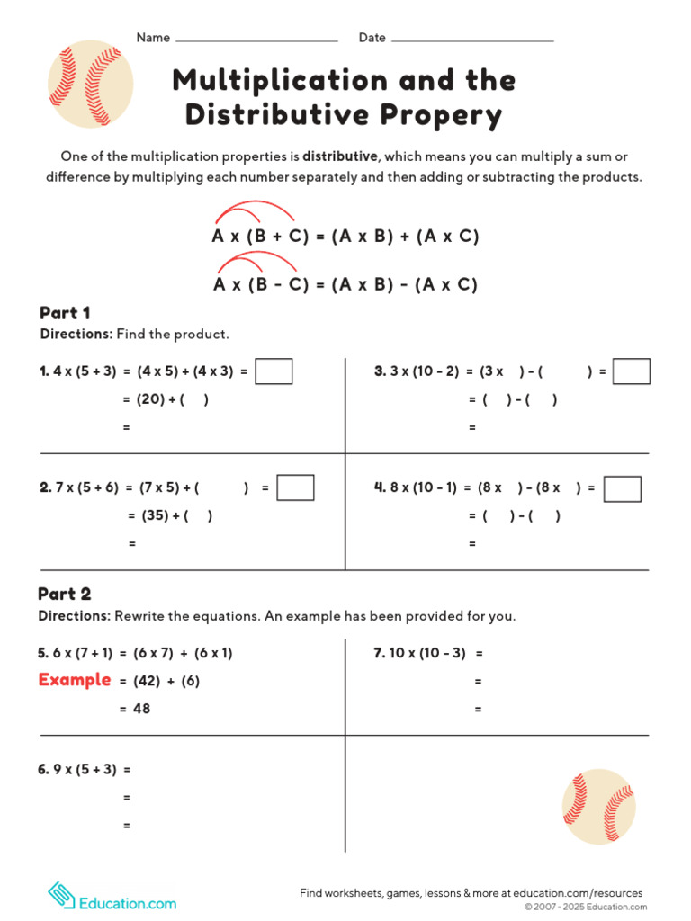 Multiplication & Distributive Property Worksheets (Printable, Online)