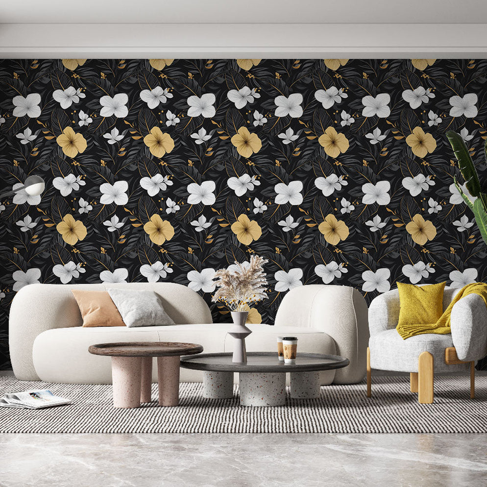 Black floral wallpaper | White and yellow flower patterns on a black b ...