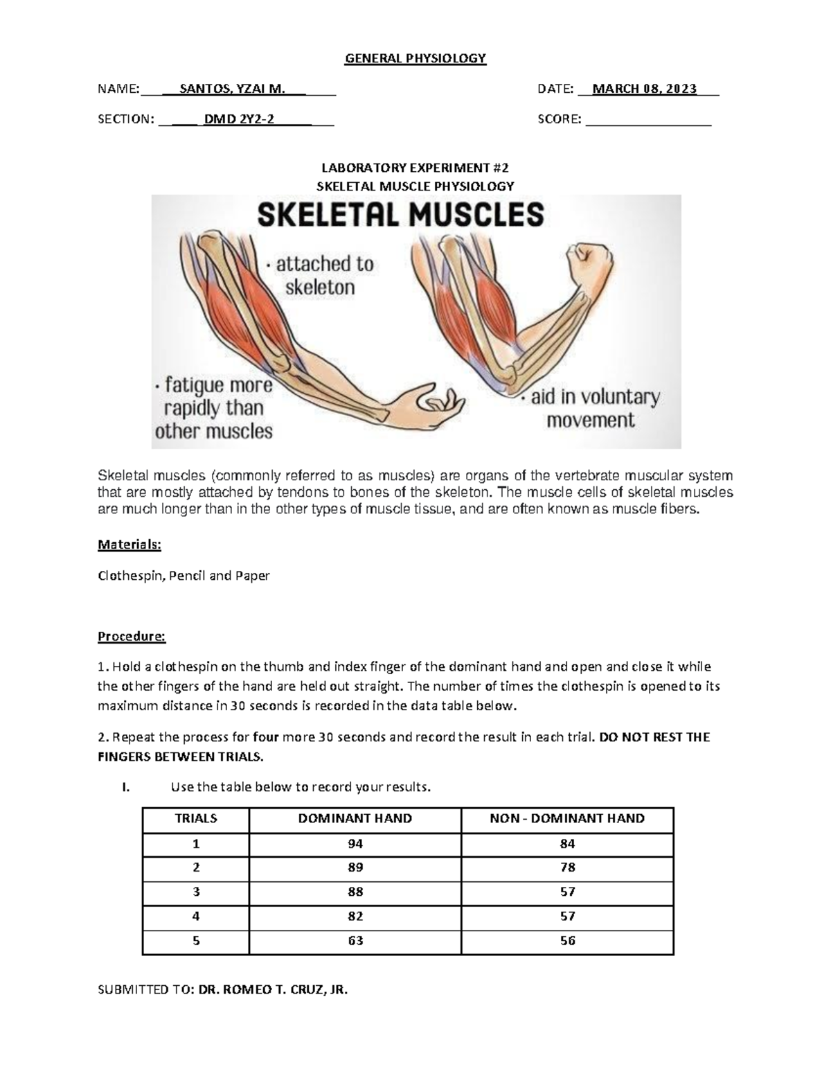 Muscle Physiology EXPT #2. Santos - SUBMITTED TO: DR. ROMEO T. CRUZ, JR ...