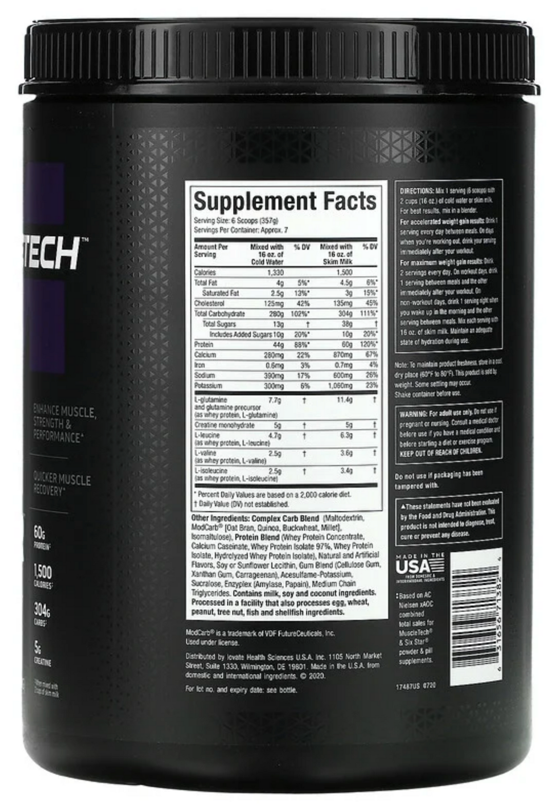 Mass Gainer Protein Powder, MuscleTech Mass-Tech Extreme 2000, Muscle ...