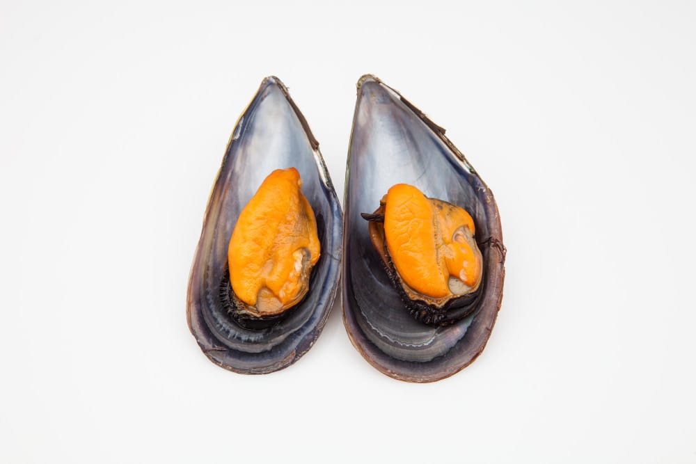 three mussel without shell isolated on white background Stock Photo - Alamy