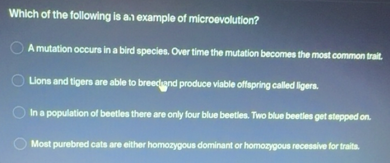 Solved: Which of the following is an example of microevolution? A ...