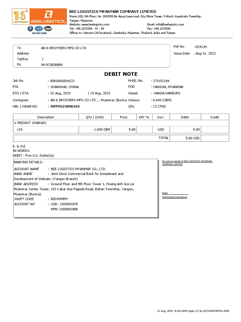 An & Brothers MFG Co LTD-13 CTNS | PDF | Invoice | Myanmar