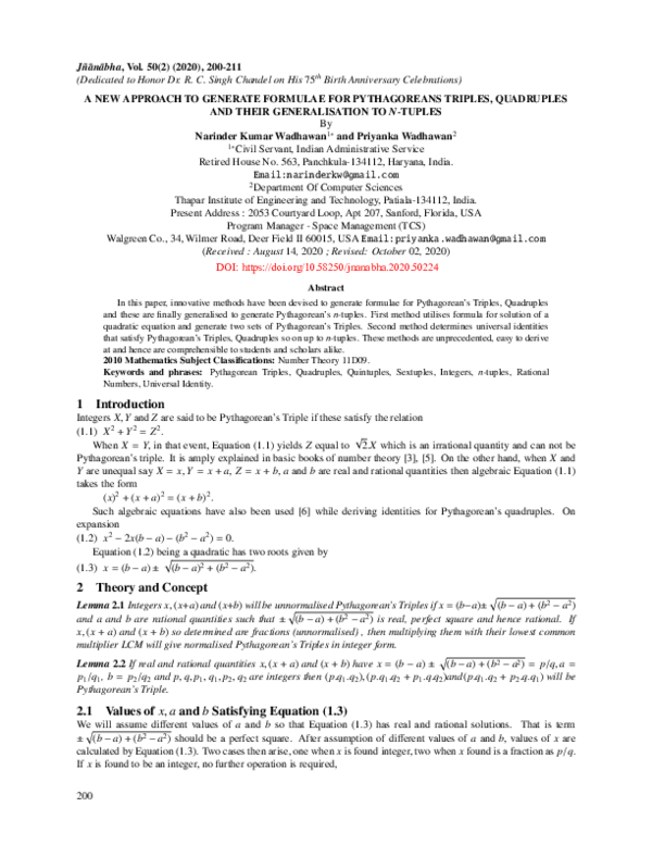(PDF) A New Approach to Generate Formulae for Pythagoreans Triples ...