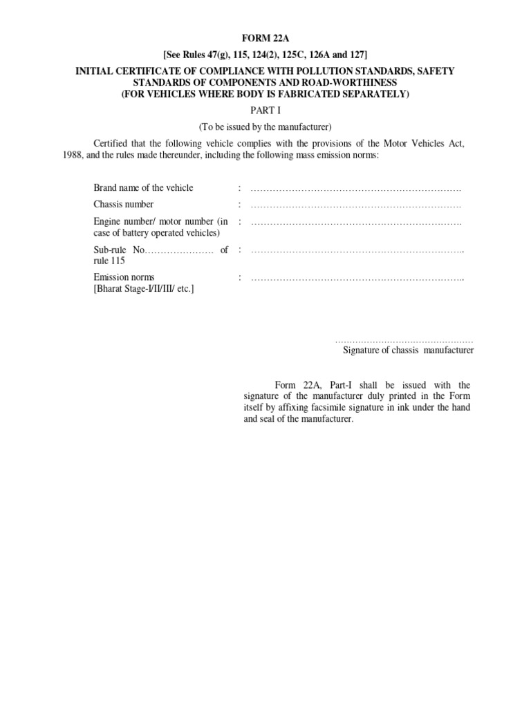 Form 22A: Vehicle Compliance Certificate | PDF