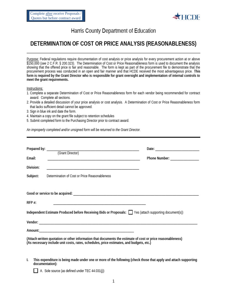 Cost or Price Analysis Form - HCDE Internal (SWL Revised 7.22.15) | PDF ...