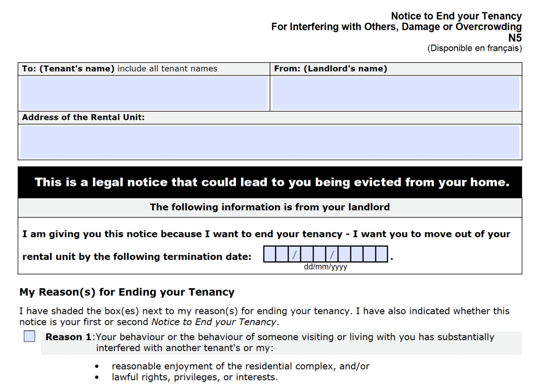 N5 FORM – NOTICE TO END YOUR TENANCY FOR INTERFERING WITH OTHERS ...