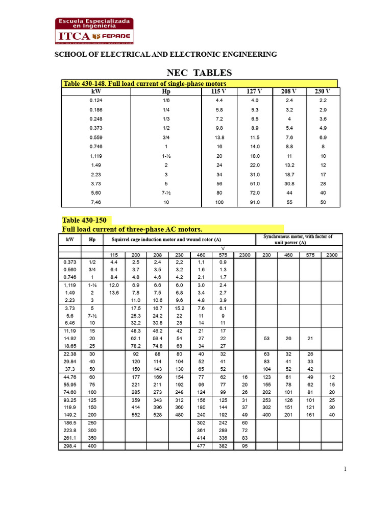NEC Table 430.250: Motor Full-Load Amps | PDF | Electric Motor | Volt