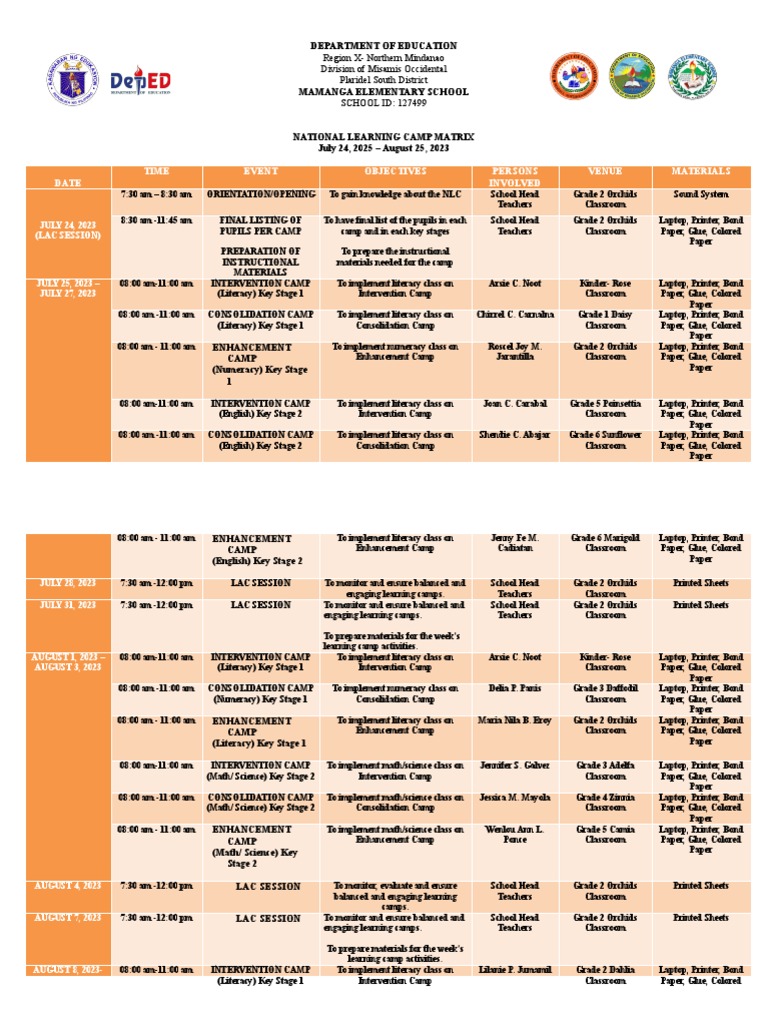 National Learning camp Activity Plan/ Matrix | DOCX