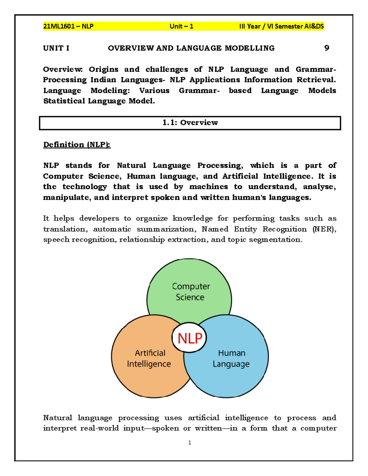 21ML1601 NLP Unit I: Overview, Language Modeling & Applications - Studocu