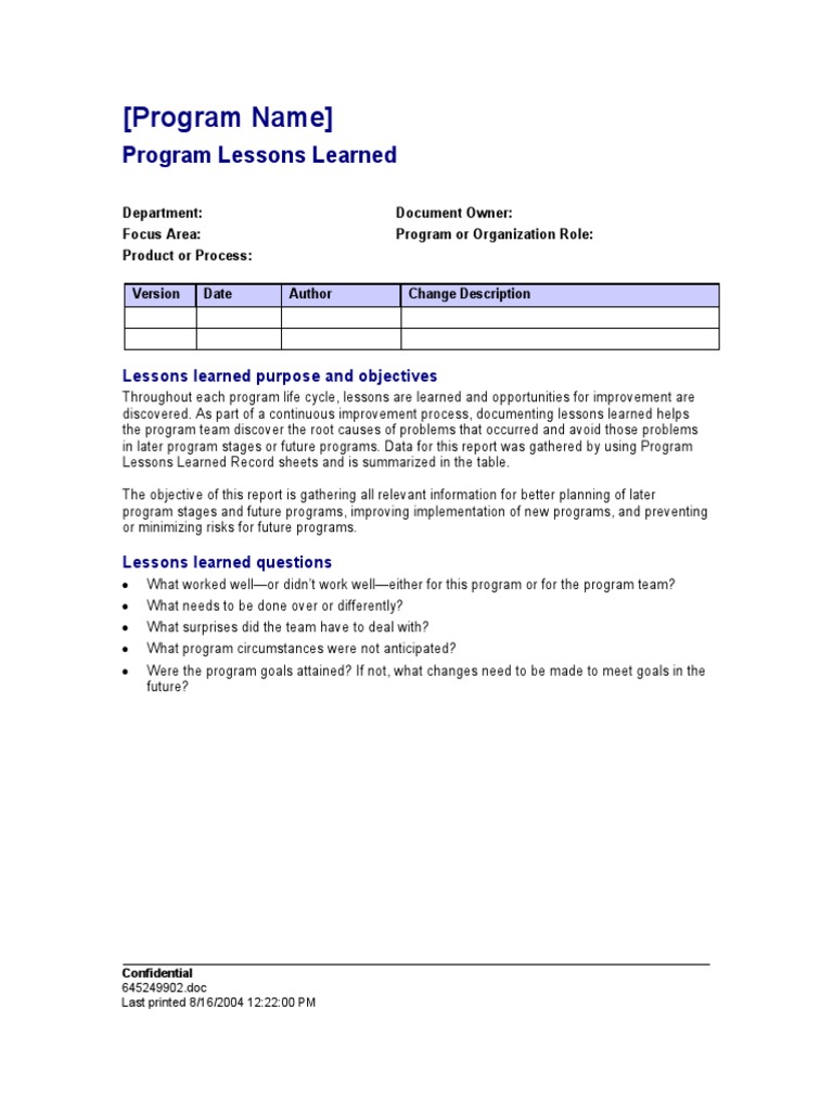Project Management Lessons Learned Template