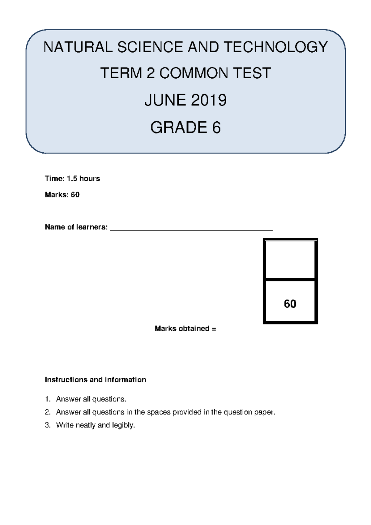 Grade-6- Nstech-JUNE-2019 - Time: 1 hours Marks: 60 Name of learners ...