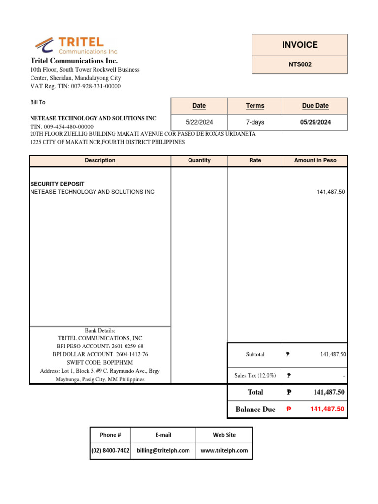 Tritel Invoice NTS002 for NetEase Tech | PDF
